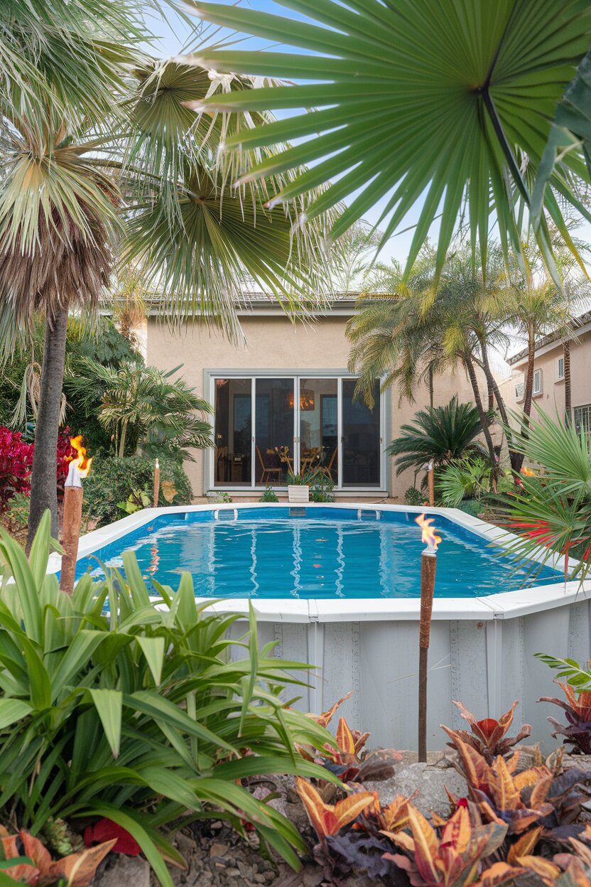 Transform your backyard into a staycation oasis with tropical plants like banana trees, ferns, and elephant ears. Add above ground pool landscaping for a resort feel, ideal for chill summer days.