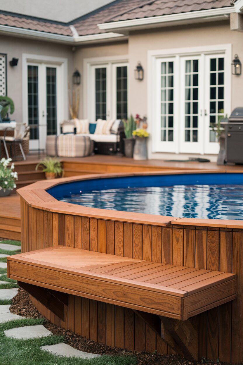 Consider adding bench seating or a sun shelf around your pool for a custom touch without going fully in-ground. These luxury above ground pool ideas can enhance your pool experience.