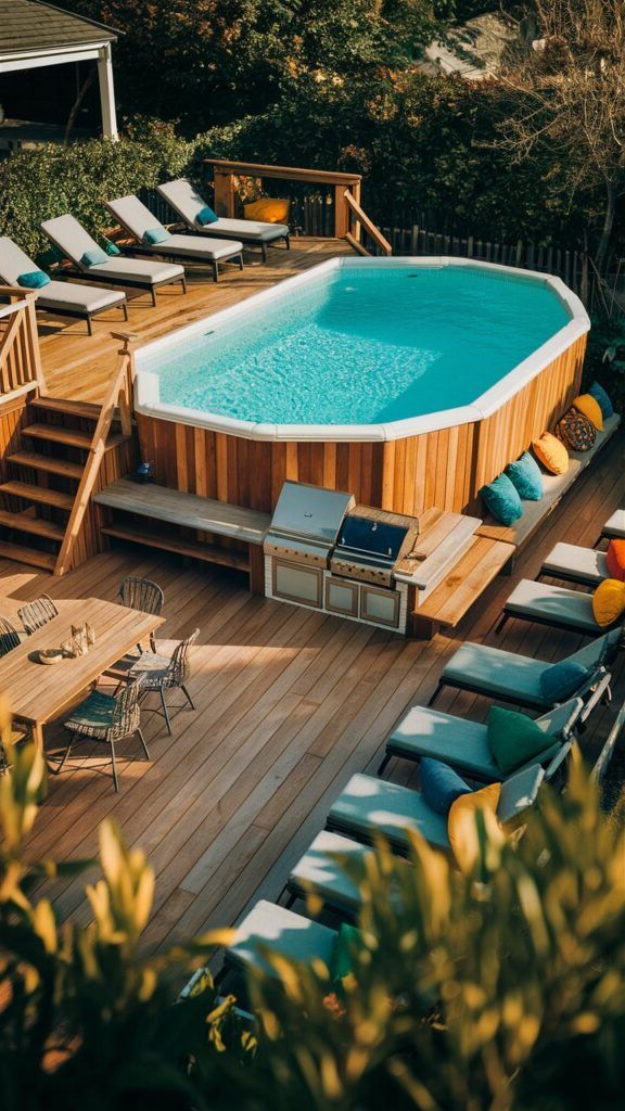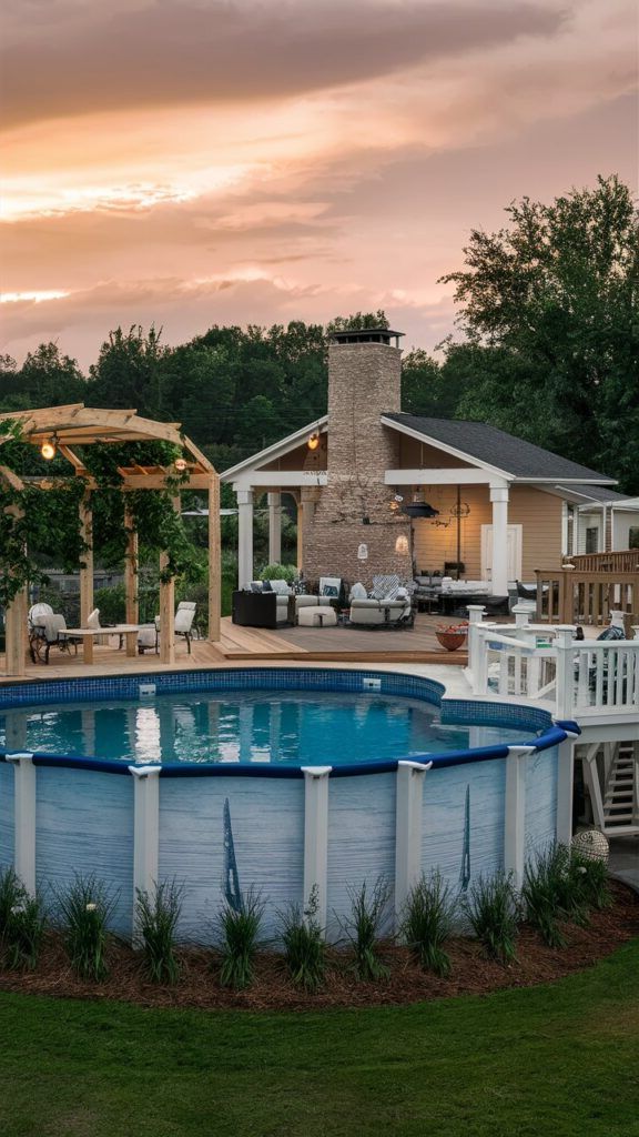 Why not match your above-ground pool deck with an outdoor fireplace for a great entertainment space? It’s ideal for chill evenings by the pool!