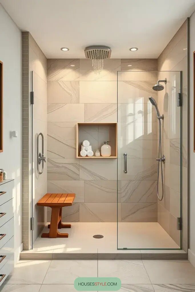I think it would be great to enhance this design by adding a teak or stone shower bench. It not only adds functionality but also brings a cozy touch, making it easier for you to relax and turn your shower time into a self-care ritual.