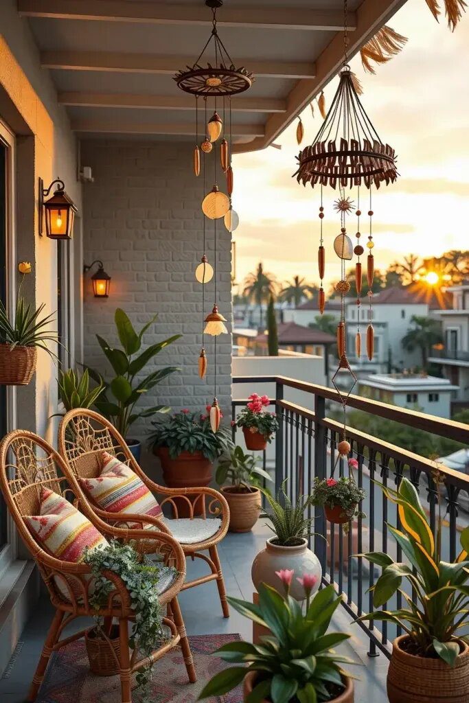 You know, a lot of folks don’t really pay attention to the sounds in design, but I’ve found that they can make a big difference in sprucing up a boho-style balcony. That’s why I like to hang up some wind chimes to give the garden a more soothing vibe. They just add that extra touch of charm, playfulness, and tranquility.