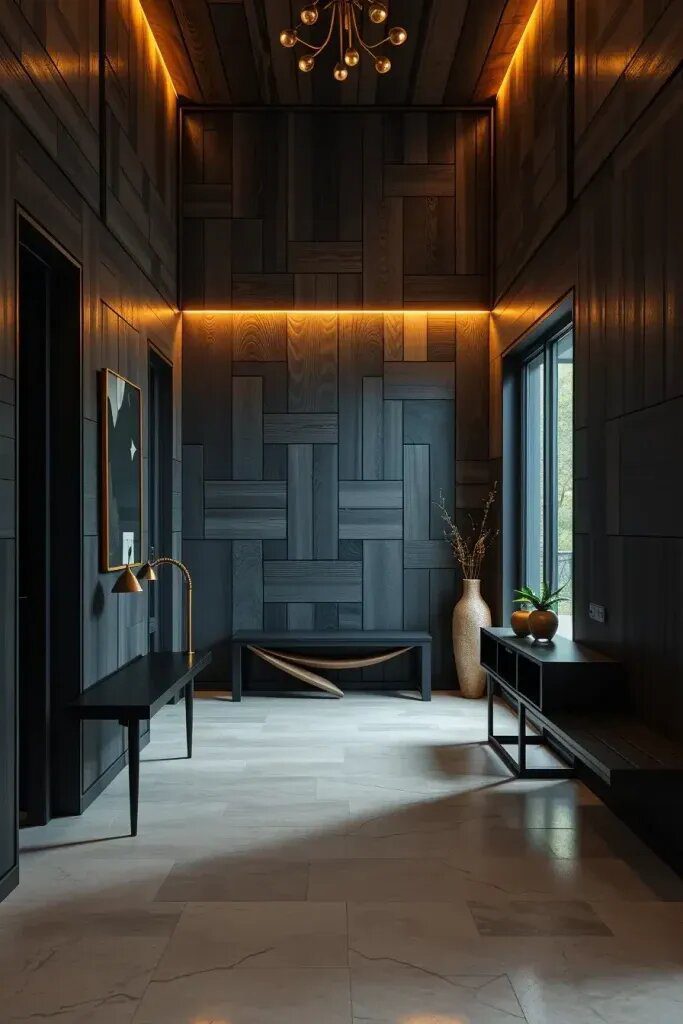 I usually only use this setup for feature panels, not the whole hallway. To get the right vibe, pair it with concrete floors, big glass panels, and furniture made of dark steel. A floating bench with charred wood that matches the room will add to the overall feel. And if you shine a soft or spotlight on the sculpture, you’ll really bring out the burned details.