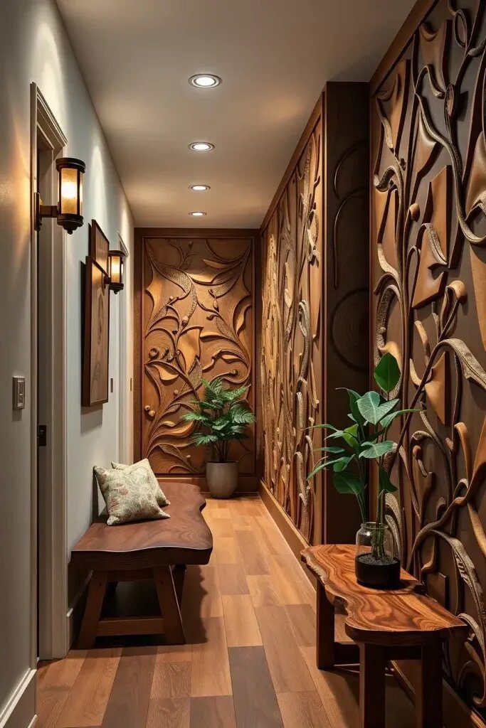 When I think about adding some storytelling and history to a hallway, I always lean towards using carved wood panels. As soon as you step inside, the rich shadows and intricate details in the wood carvings really capture the essence of the space. These panels work great in more classic setups, but they can also blend nicely in modern homes if you keep the design clean and simple.