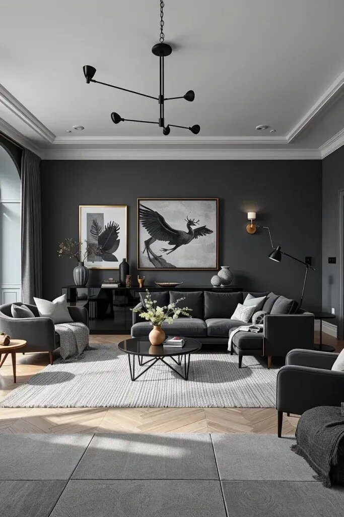 So, one time I designed this cool living room with a slate-gray theme. I painted the walls charcoal, got a comfy graphite sectional, a sleek black lacquered sideboard, and some chic smoked glass light fixtures. Even the artwork matched the vibe – all grayscale and framed in brushed steel. The whole look was about creating a cozy yet elegant space that didn’t feel cramped. I dubbed it “Mellow Elegance” and my clients absolutely loved it.