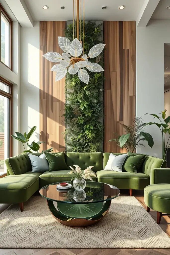 Oh, I remember this one project I worked on that was really cool! We had this moss green velvet couch paired with a glass coffee table that looked like a leaf. The walls were a mix of bamboo paneling and living vertical gardens, which gave it a really unique feel. And then we had these sculptural ceiling pieces with frosted acrylic falling petals that added a nice soft light to the room. It was such a chill vibe, but it definitely made a big impact.
