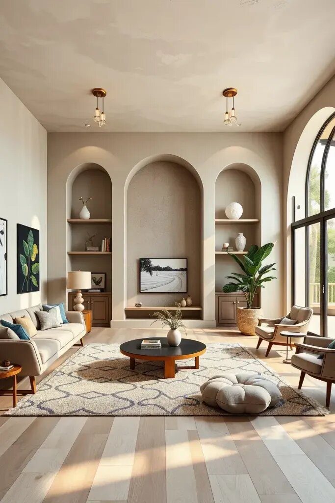 I love adding arches and cool angular structures to living rooms because they really make a statement. For example, in one of my designs, I put in a big arch-shaped cutout in the wall to frame the entertainment center. Then I added some sharp cornered shelves to create a cool, layered look that almost feels like a piece of art. I think mixing the curves and straight edges really brings the whole room to life!