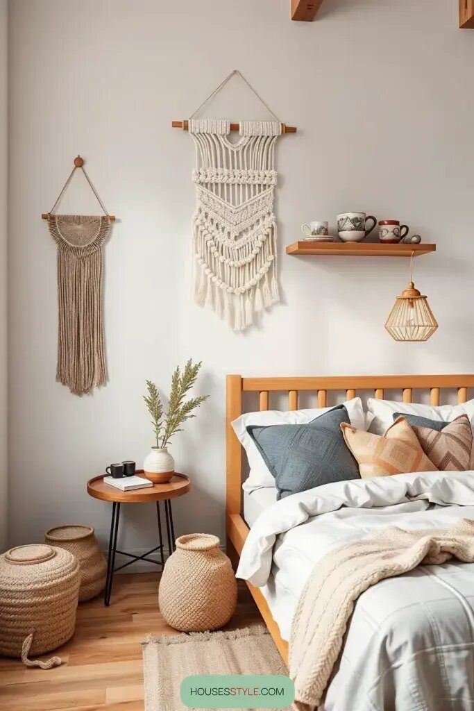 When it comes to adding handmade decorations to a Japandi style bedroom, I’m totally on board! But I think it’s important for those handmade pieces to serve a purpose, either by looking great or being useful. A Japandi bedroom isn’t about cluttering every surface with stuff, so every item should be special or functional. This style creates a cozy atmosphere that feels carefully put together, without being too busy or messy.