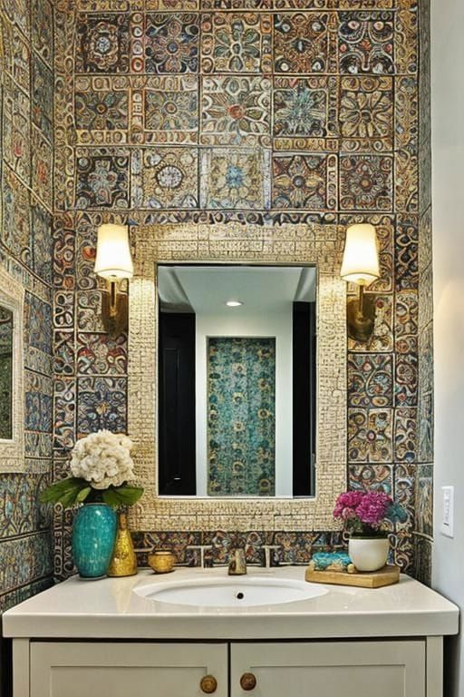 A mirror surrounded by colorful mosaic tiles adds an artistic flair and a pop of color, making it a playful yet elegant addition to any space.