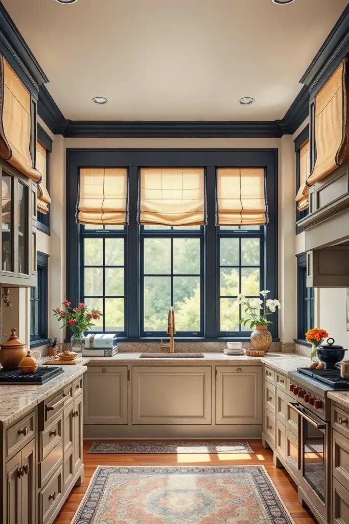 If you’re going for a Ralph Lauren-inspired kitchen vibe, make sure your drapes or blinds are a good fit and have a subtle, classy look. Personally, I like to DIY Roman shades using fabrics like ticking stripe or linen, or opt for café curtains lined with grosgrain ribbon. Just adds a touch of elegance to the space.