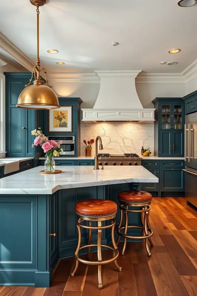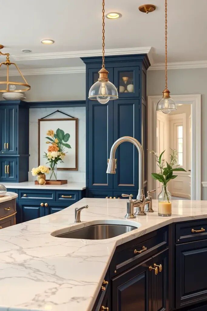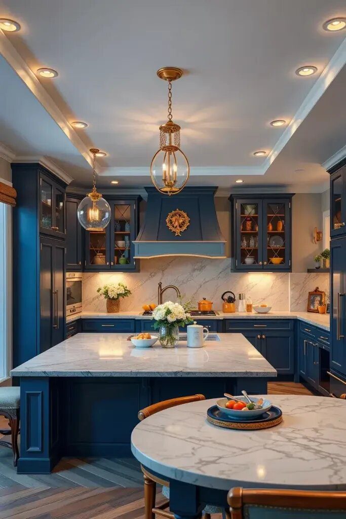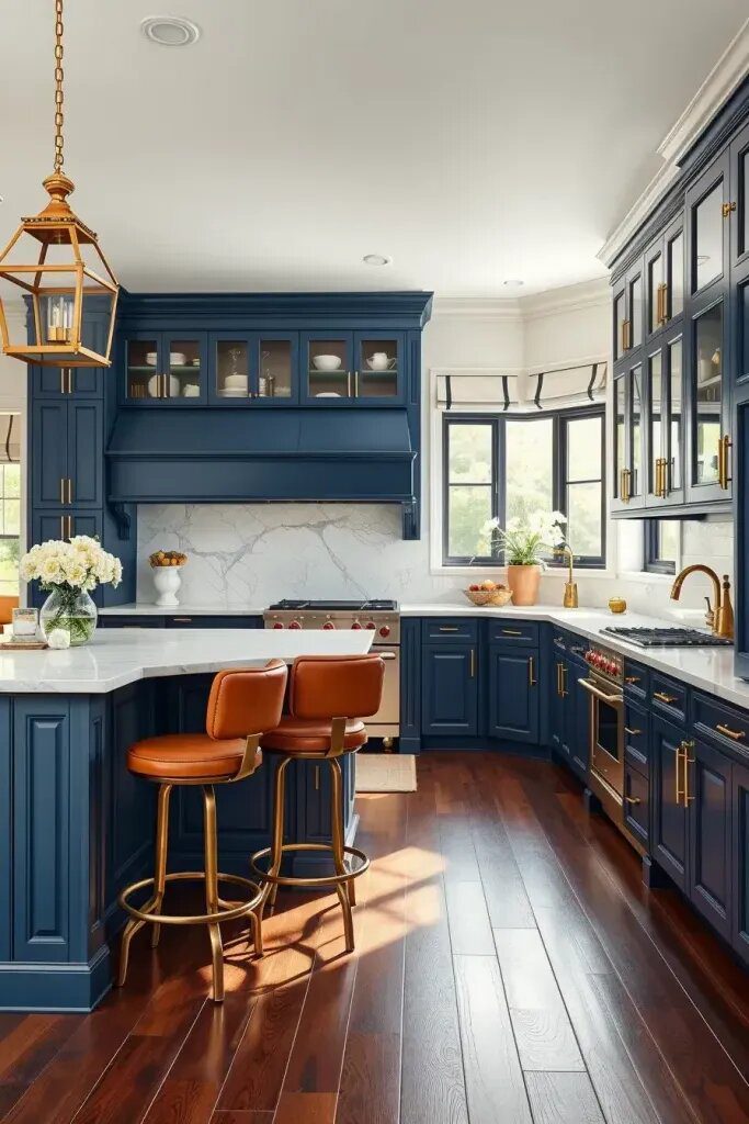 When you think of classic American design, navy blue cabinets just seem to fit the bill, don’t they? And let me tell you, adding in a bold yet elegant tile from Ralph Lauren really takes the kitchen up a notch. I personally love how using navy for the base cabinets or island, along with some brass handles and marble accents, really ties everything together. The deep color gives the kitchen a certain presence and a timeless vibe that just feels right.