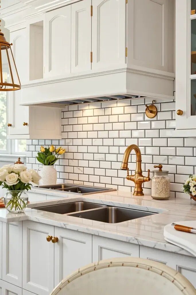 Have you ever seen a kitchen with a whitewashed brick wall? It gives off such a classic and cozy vibe. You know, kind of like the ones you see in those fancy East Coast houses, like those from Ralph Lauren’s Hamptons collections. Just make sure the brick texture is smooth and not too rough or earthy-looking. Just a little tip!