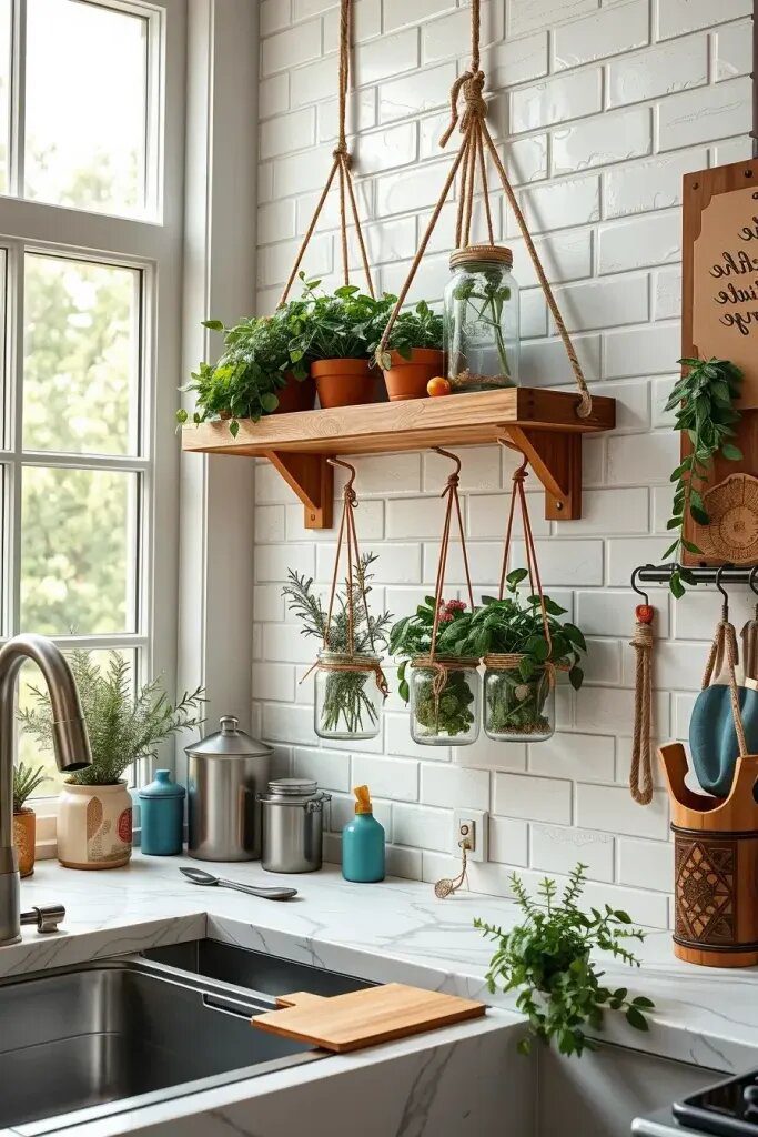 So for this project, I grabbed some wood, jute rope, metal hooks, and mason jars. I thought it would be cool to put up a backsplash against some white subway tiles to really make it pop in the kitchen. Plus, basil, thyme, parsley, and rosemary will not only grow well together inside but also add a nice touch of greenery. I set up the whole thing by a big kitchen window to keep the plants nice and sunny all day long. And you know, you could always switch out the ceramic pots for a more polished look or use reclaimed wood for a more rustic vibe. Just a little tweak could make it even better!