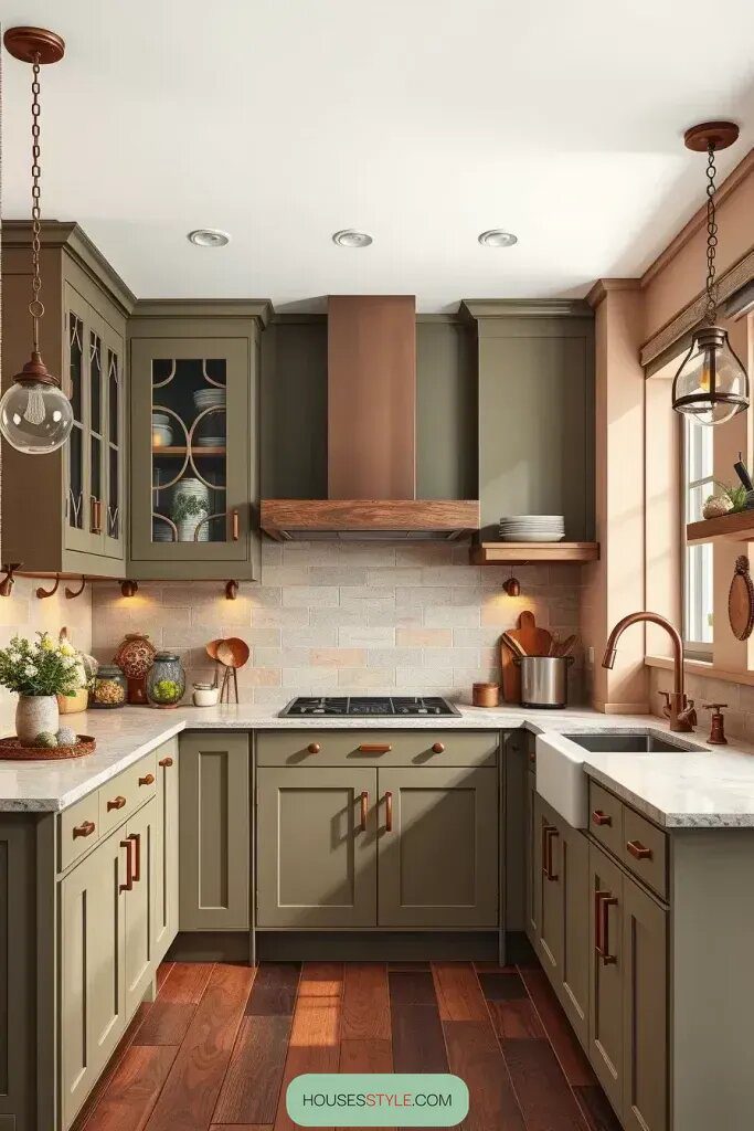 When it comes to the cabinets, I really love the olive and slate green matte finishes – they just add such a nice pop of color! As for the walls, I think soft beige or stone gray would be perfect to make the space feel open yet cozy. And don’t even get me started on brushed bronze, oiled wood, and aged copper – they really bring out that rustic vibe I’m going for.