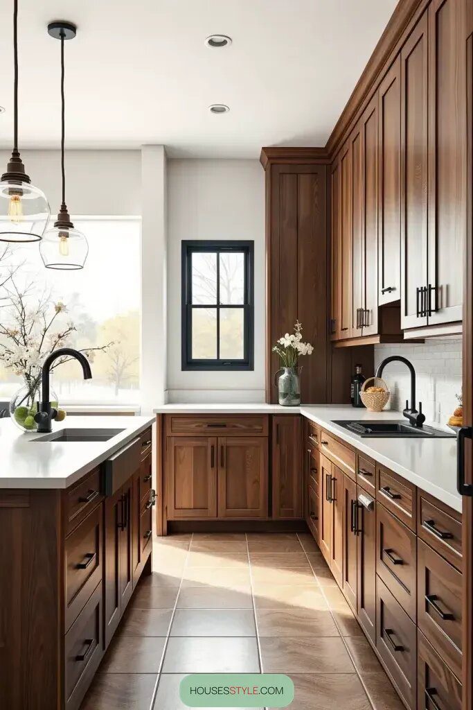 You know what looks really cool and stylish in a kitchen? When you mix warm wood cabinets with matte black fixtures. It’s like bringing together a touch of nature with a touch of modern. Plus, it works great in any size kitchen!