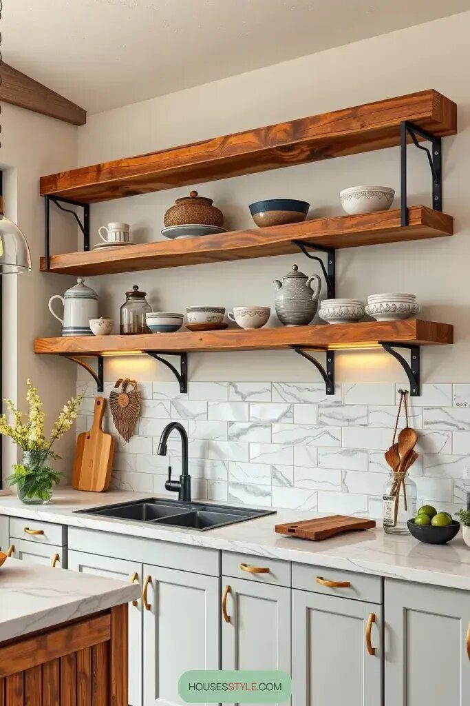 Displaying your personal style and keeping your kitchen items organized is a breeze with open shelving. Using reclaimed wood for the shelves gives off a cozy and inviting feel. Personally, I love the look of sturdy, raw-edged wood slabs supported by dark metal brackets for a bold and eye-catching statement.