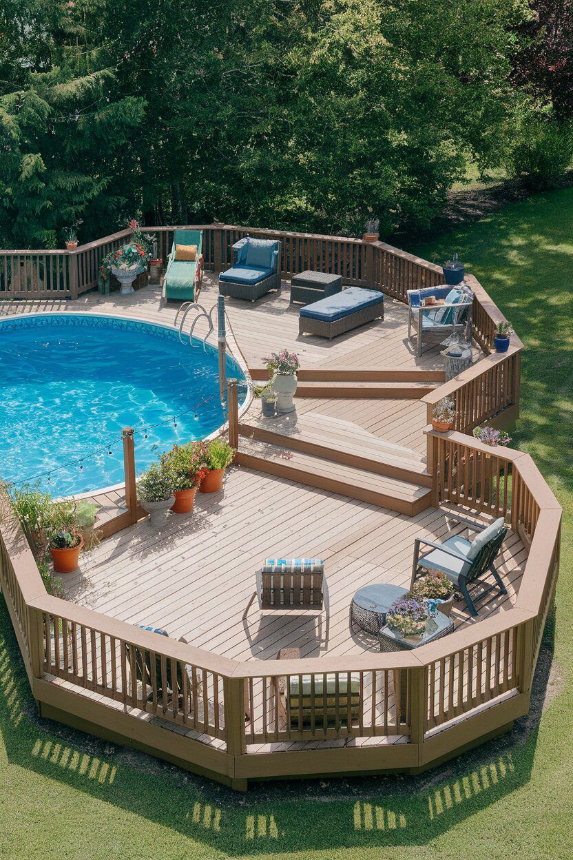 If your backyard is sloped, consider a tiered deck for a seamless and natural look. One level for pool access, the other for lounging or dining.