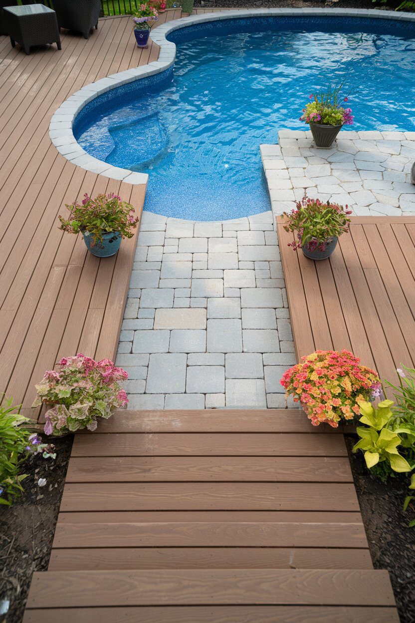 Mixing pavers and decking is a smart way to upgrade your above ground pool. Pavers provide durability, while wooden decking adds a cozy feel. It’s low maintenance and gives your pool area a distinct style.