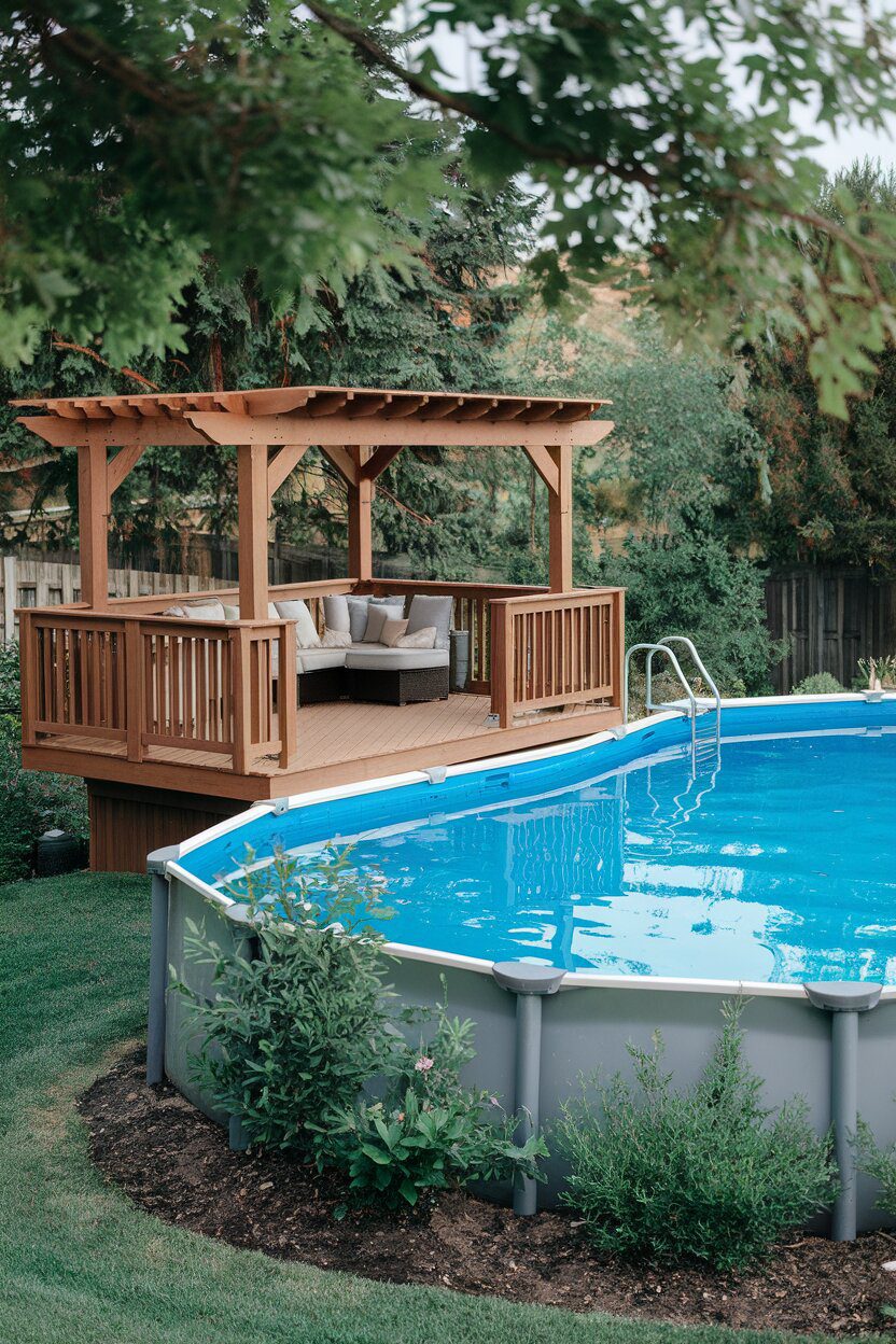 Adding a multi-level deck to your above ground pool can really enhance your outdoor space. It creates separate spots for chilling, eating, and poolside lounging. I adore how it makes the yard feel bigger and links the pool with the rest of the garden.
