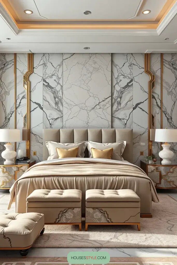 Marble and stone accents are super popular right now in fancy bedroom designs, especially for folks who like to have a touchable space. Whether it’s travertine nightstands, onyx lamp bases, or marble paneling, these little details add just the right amount of depth and visual appeal to the room without making it feel too busy.