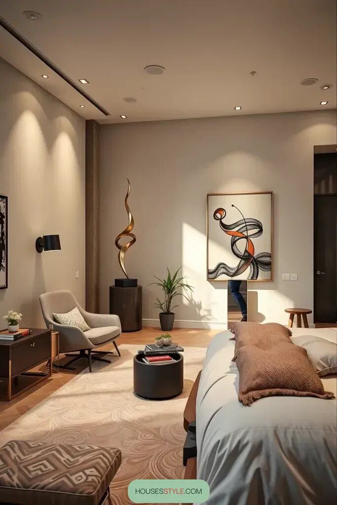 Adding sculpture sconces, ceiling lights with dimmers, and floor lamps in the lounge area gives you flexibility with warm, layered lighting. And don’t forget about hanging some cool art or putting up a big mirror to make the room feel even bigger.