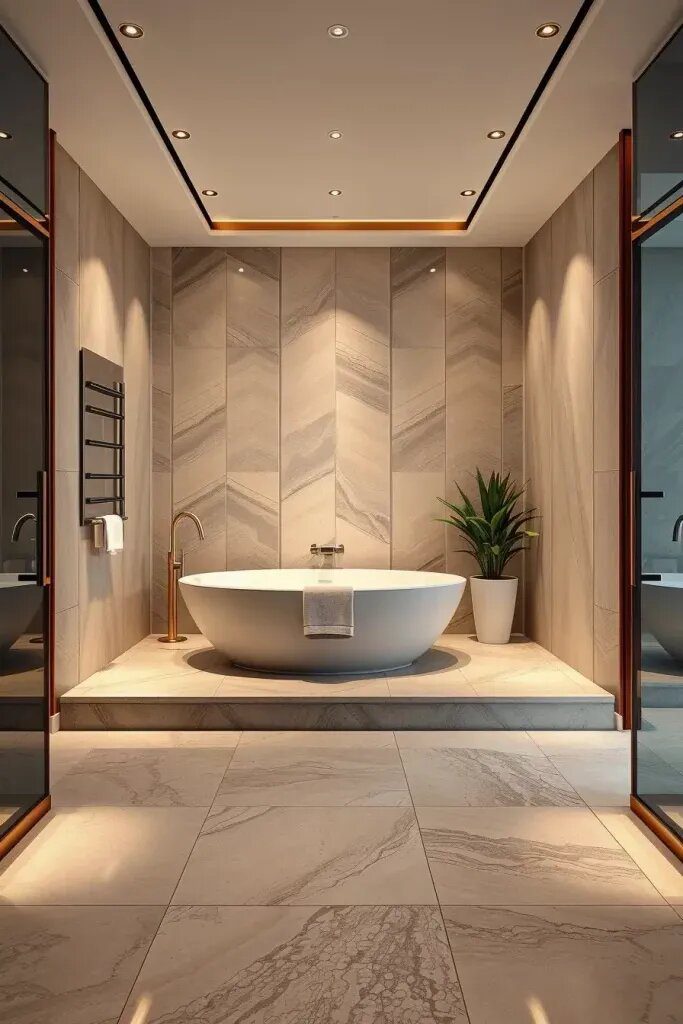 Have you seen those cool tub styles that seem to float in a room? They’re typically made of high-quality materials like acrylic or stone, so their edges are level with the floor. A tip I have is to use wood planks or textured tiles to subtly mark the entry point without making it too obvious. Adding elements like floor lighting, wall storage nooks, and fancy waterfall faucets can really make the design pop and bring everything together beautifully.