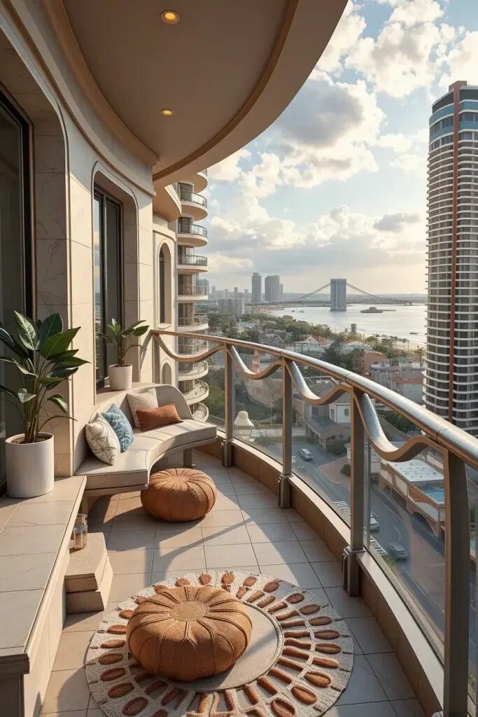 In my designs, I enjoy using mirrored side panels or railings made of durable glass that can withstand the weather. I like to add some lightweight decor, such as potted succulents, to give the space a cozy feel. To keep the balcony looking sleek and uncluttered, I opt for low-profile furniture like polished stainless steel or lucite seating. I also incorporate minimalist planters with succulents and some decorative lighting for added ambiance.