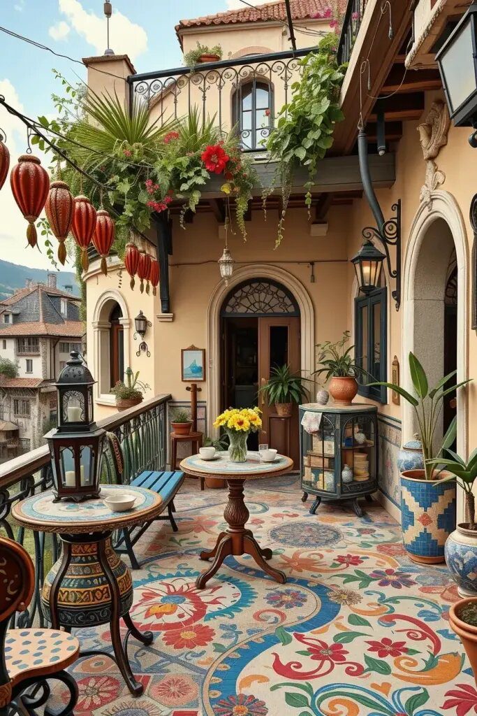 I really love balconies that have mosaic tiles because you can tell that a lot of care and creativity went into making them. It’s amazing to see how these balconies turn into works of art, with the floors and walls decorated with cultural designs, architectural elements, or even abstract paintings inspired by the area. It’s like turning a regular balcony into a piece of art that adds so much personality to the outdoor space.