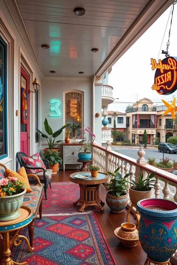 You definitely need banners on your balcony, and don’t forget about mural paintings on the walls – those are a must-have! Oh, and bright furniture, patterned outdoor rugs, and colorful wall art are essential too. I like to mix things up by pairing neon signs in colorful planters with stylish art deco chairs overlooking the untamed jungle. It really adds depth and richness to the space. And when you blend different textures like floral, tropical, and geometric patterns, that’s when the magic really happens!